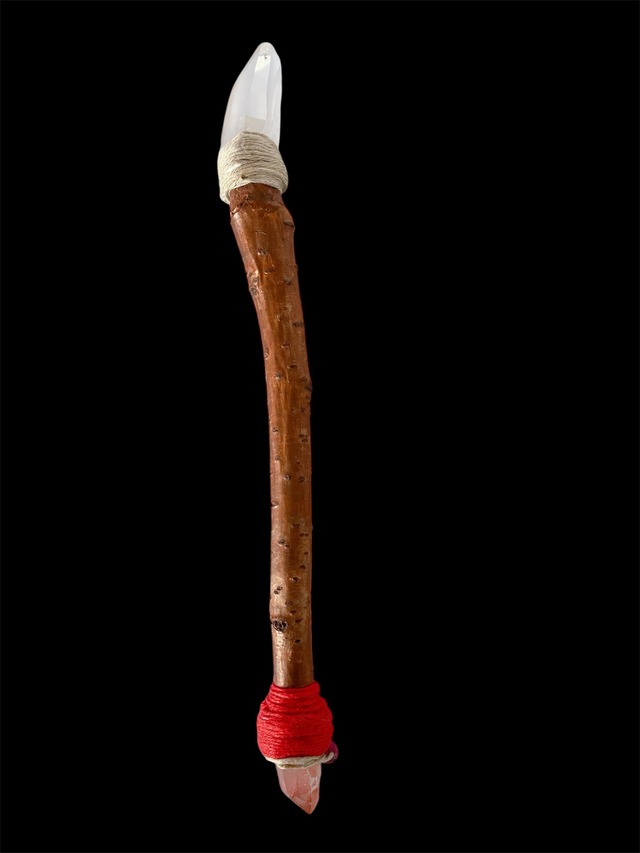 とても重量感のあるレムリアンシードのついたワンドです。 その反対側にはピンクレムリアンシードがつけてあり、底につけられたピンクの玉は、アマゾンのシャーマンからのジャングルの貴重な木の実です。 このワンドに秘められたパワーは、愛と調和の世界「レムリアの再誕」です。 それは、かつてのレムリアを想起するだけではなく、その世界を遥かに超えていく優美さを兼ね備えたパワーを持ちます。 これからの人生を愛と調和と発展、進化させていきたい方、自分の人生のみならず大きく世界を変えていきたい方。そんな思いを持つ方にもお勧めのワンドです。 レムリアンシードとは? 幻の大陸レムリアの情報を宿す希少な水晶で、「レムリアンリッジ」と呼ばれるバーコード状の成長線があるのが特徴。 古代のレムリア人が、未来の私たちのためにクリスタルに宿した愛と調和と叡智をぜひ受け取ってください。 また、潜在能力の開花や本当の自分への目覚め、ハイヤーセルフなどの高次存在との繋がりを高めるとも言われています。 レッドレムリアンシードは「全能の石」ともいわれ、天然の色が着いたものは大変珍しく採掘される数も少なくとても貴重なものです。 使用している木は天然の桜で3年じっくりと乾燥させてあります。 桜には、邪気払いや浄化のパワーと、生命力・豊かさ・始まりの意味を持ちます。 桜の木に宿る精霊には、良縁など、素敵な人との出逢いを運んできます。 【商品詳細】 ・クリスタル:レムリアンシード、レッドレムリアンシード ・ワンドの長さ:30cm ・ワンドの総重量:94g ・その他:桜、麻紐、アマゾンの実 ⭐︎ワンドを選ぶときのポイント⭐︎ 直感、ワクワクする気持ち、ハートが温かくなる感覚、第3の目がむずむずする、“ふと欲しい”と思う優しい感覚などです。 ぜひ参考にしてみてください。 ⭐︎ワンドの使い方⭐︎ ・クリスタルの先端を患部に当ててヒーリングをする。 ・部屋に置く。インテリアとして置いておくだけでも、部屋の空気が変わります。 ・瞑想するときに ・その他、インスピレーションに従って自由にお使いください。 *お取り扱いには充分にご注意ください *浄化したい時は水で洗わずに、スマッジング(煙で浄化する)かさざれ石などをお使いください