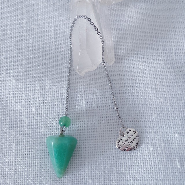 優しいグリーンのアベンチュリンは、心の安定と調和をもたらしてくれる癒しの石です。 ストレスなどの精神面と体の健康を守ってくれます。 モチーフには、神様の使いとして幸運やラッキーを運でくる「蝶」と「ハート」が付いています。 幸運や変化、復活と再生などの意味も持ちます。 新しい転機やプロジェクなどのスタートのタイミングや、高次元に導かれながら幸せな人生をいきたい方などにオススメです。 ペンジュラムは、あなたの本当の願いと繋がって導きや答えを教えてくれます。 心の中の迷いを払拭したいときや、幸せの道標の選択のためにお使いください。 人生の道に光を届けます。 世界に一つだけのペンジュラム 【商品詳細】 全長:約18.5cm クリスタルサイズ:2cm クリスタル:アベンチュリン モチーフ:蝶、ハート ------ ☆ペンジュラムが手元に来たらまずやって欲しいこと☆ まるでペットを迎え入れるように「これからヨロシクね」と手のひらに乗せて優しく挨拶してください。 ペンジュラムは、使えば使うほどに意思疎通ができ答えがキャッチしやすくなります。 ペンジュラムは「Yes」か「No」で答えてくれますので、まずはあなたにとってのYesとNoの動きを確認しましょう。 【動きの確認の仕方】 ①利き手にペンジュラムを持ちます。 少し縦に揺らします。 ②Yes(はい、◯)になる質問を声に出すか心の中でします。 例えば、「今の私は女性ですか?」など。 しばらくすると、右回転か左回転しはじめます。 その動きがあなたの「Yes」の時のペンジュラムの動きになります。 ③今度は答えがNo(いいえ、×)になる質問をして、さっきと逆回転になるかを確認してください。 初めのうちは小刻みに動いたりなど、回転が分かりづらい場合もあるかもしれませんが、ペンジュラムと仲良くなるように何度か行っているとだんだん分かってきます。 あなたにとっての「Yes」or「No」の動き(サイン)を見つけて、クリスタルと共振共鳴して素敵な未来を創造していってください。 *お取り扱いには充分にご注意ください