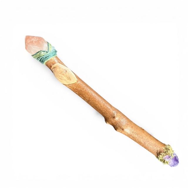 太めのピンクレムリアンシードとアメジストのワンドです。 とても手にフィットするワンドの枝はレモンユーカリで、空間や心身の浄化、そして再生と成長を意味する聖なる木です。 このワンドに秘められたパワーは、本来スピリットであることを思い出し、自由の中で生きることを助けます。 これまでの生き方や信念や概念に縛られずに、自由に自己表現し幸せに生きたい方にお勧めです。 またこのワンドは神聖さを彷彿させます。 ソース(源.神)の一部としてここに生きている喜びを取り戻します。 魂からの喜びを感じながら生きたい方のサポートに。 レムリアンシードとは? 幻の大陸レムリアの情報を宿す希少な水晶で、「レムリアンリッジ」と呼ばれるバーコード状の成長線があるのが特徴。 古代のレムリア人が、未来の私たちのためにクリスタルに宿した愛と調和と叡智をぜひ受け取ってください。 また、潜在能力の開花や本当の自分への目覚め、ハイヤーセルフなどの高次存在との繋がりを高めるとも言われています。 レッドレムリアンシードは「全能の石」ともいわれ、天然の色が着いたものは大変珍しく採掘される数も少なくとても貴重なものです。 使用している天然レモンユーカリは約3年かけてじっくりと乾燥させてあります。 ユーカリの木は空間のエネルギーを浄化し、心に活力と冷静さ、思考をクリアにする、再生などの意味を持ちます。 【商品詳細】 ・クリスタル:レッドレムリアンシード、アメジスト ・ワンドの長さ:25.5cm ・ワンドの総重量:70g ⭐︎ワンドを選ぶときのポイント⭐︎ 直感、ワクワクする気持ち、ハートが温かくなる感覚、第3の目がむずむずする、“ふと欲しい”と思う優しい感覚などです。 ぜひ参考にしてみてください。 ⭐︎ワンドの使い方⭐︎ ・クリスタルの先端を患部に当ててヒーリングをする。 ・部屋に置く。インテリアとして置いておくだけでも、部屋の空気が変わります。 ・瞑想 ・その他、インスピレーションに従って自由にお使いください。 *お取り扱いには充分にご注意ください *浄化したい時は水で洗わずに、スマッジング(煙で浄化する)かさざれ石などをお使いください