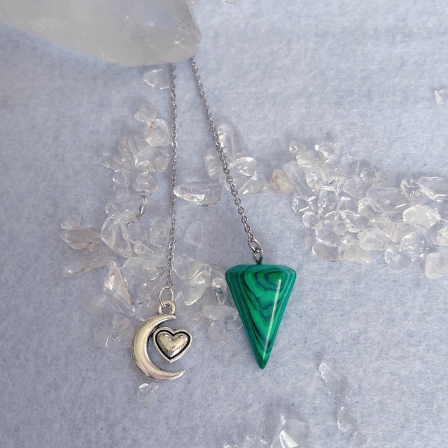 鮮やかな緑色に黒い模様が特徴の「マラカイト」 それが孔雀が羽を広げた時の眼のように見えることから、霊眼や洞察力を高める力を与えるといわれています。 「魔除け」や「邪気を払う」パワーストーンとして、お守りとしても持ち歩けます。 石言葉は「再会」「恋の成就」「癒し」 恋愛や癒しを求めている人におすすめです。 ペンジュラムは、あなたの本当の願いと繋がって導きや答えを教えてくれます。 心の中の迷いを払拭したいときや、幸せの道標の選択のためにお使いください。 人生の道に光を届けます。 【商品詳細】 全長:18cm クリスタルサイズ:2cm クリスタル:マラカイト モチーフ:月、ハート ーーーーーーーー ☆ペンジュラムが手元に来たらまずやって欲しいこと☆ まるでペットを迎え入れるように「これからヨロシクね」と手のひらに乗せて優しく挨拶してください。 ペンジュラムは、使えば使うほどに意思疎通ができ答えがキャッチしやすくなります。 ペンジュラムは「Yes」か「No」で答えてくれますので、まずはあなたにとってのYesとNoの動きを確認しましょう。 【動きの確認の仕方】 *チェーンを短めに持つと分かりやすいかもです。 ①利き手にペンジュラムを持ちます。 少し縦に揺らします。 ②Yes(はい、◯)になる質問を声に出すか心の中でします。 例えば、「今の私は女性ですか?」など。 しばらくすると、右回転か左回転しはじめます。 その動きがあなたの「Yes」の時のペンジュラムの動きになります。 ③今度は答えがNo(いいえ、×)になる質問をして、さっきと逆回転になるかを確認してください。 初めのうちは小刻みに動いたりなど、回転が分かりづらい場合もあるかもしれませんが、ペンジュラムと仲良くなるように何度か行っているとだんだん分かってきます。 あなたにとっての「Yes」or「No」の動き(サイン)を見つけて、クリスタルと共振共鳴して素敵な未来を創造していってください。 *お取り扱いには充分にご注意ください