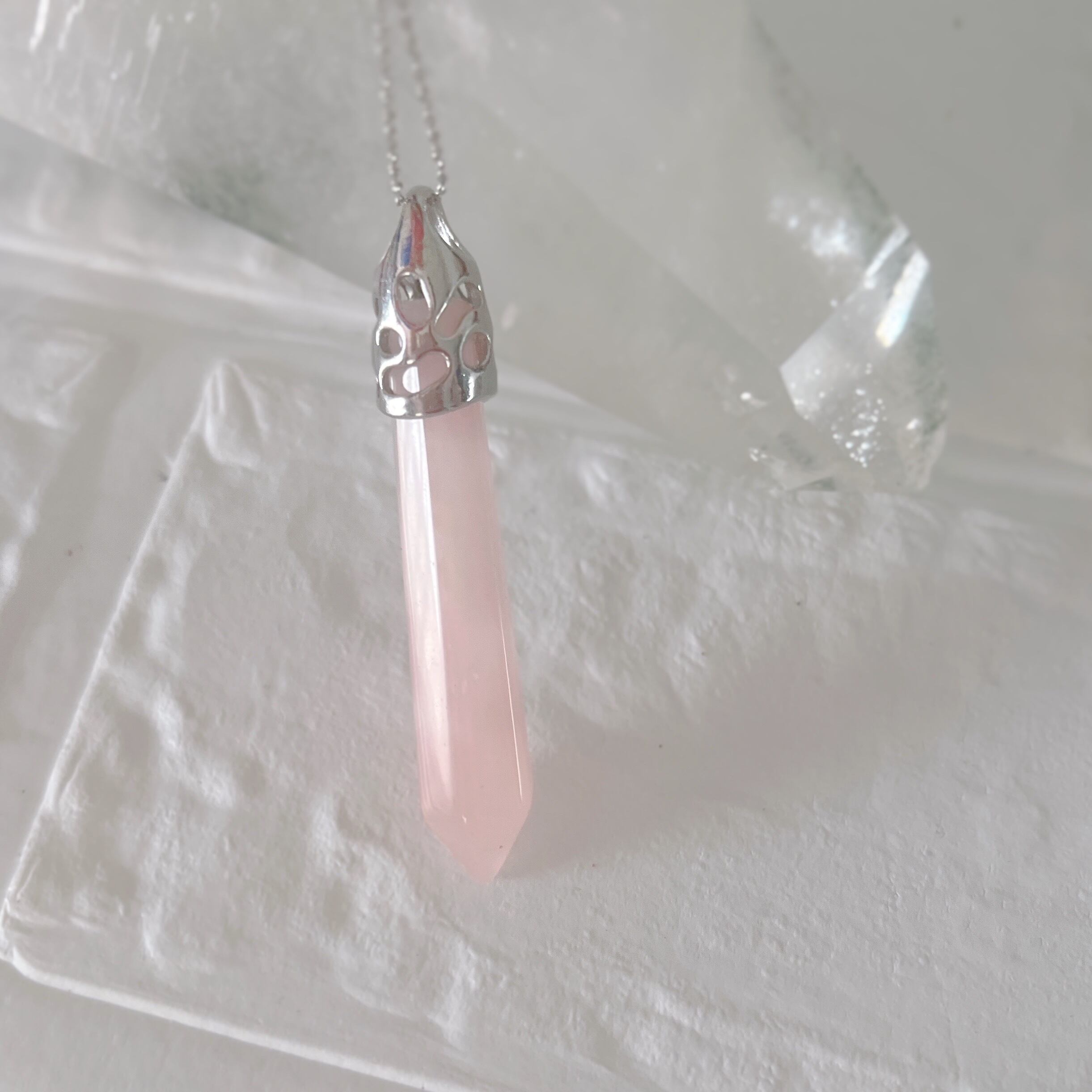 胸元で優しくエネルギーを放つローズクォーツのペンダントは、ペンジュラムとしてもご利用いただけます。