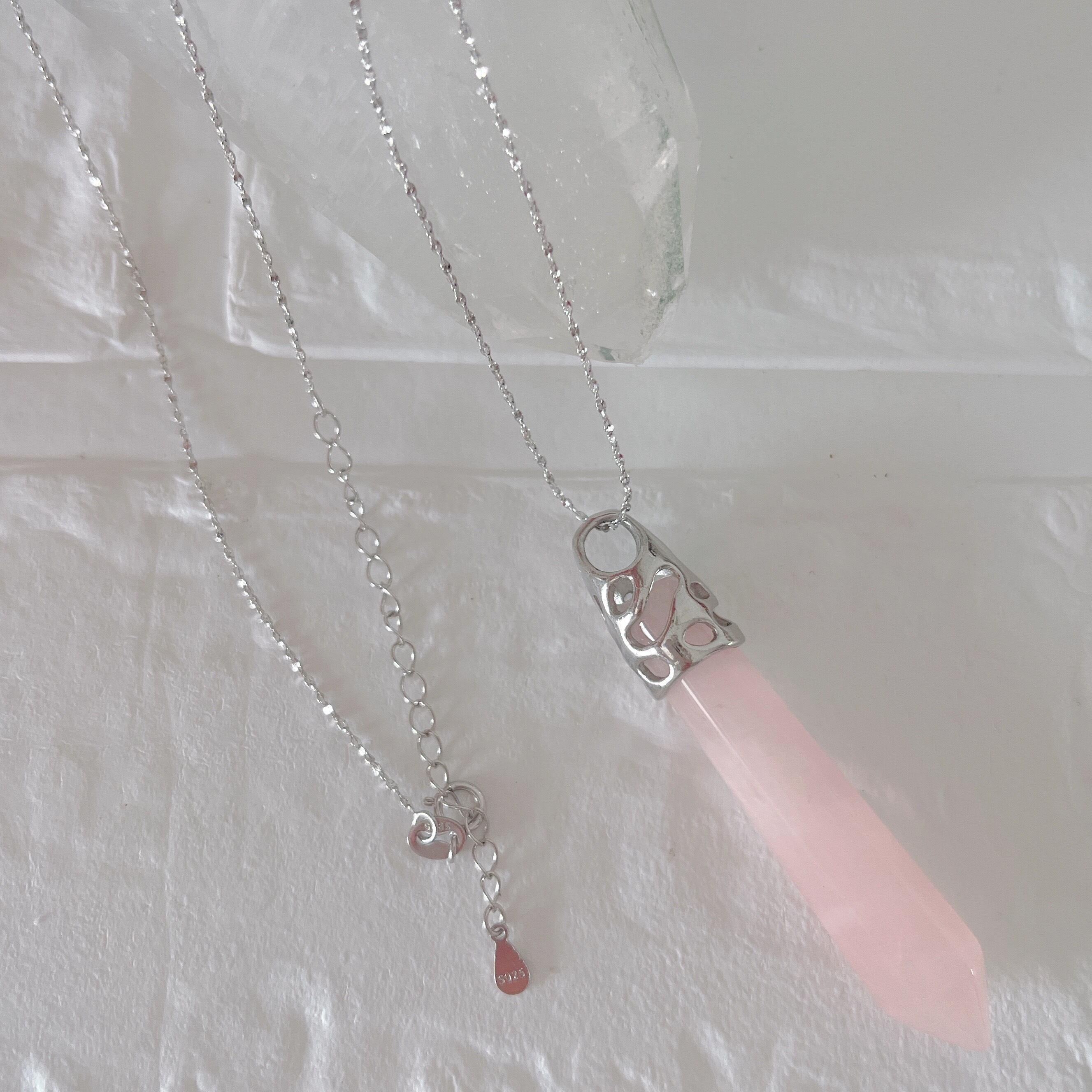 チェーンはローズクォーツの優しいピンク色に合うようにキラキラ輝くシルバー925を使用しています。