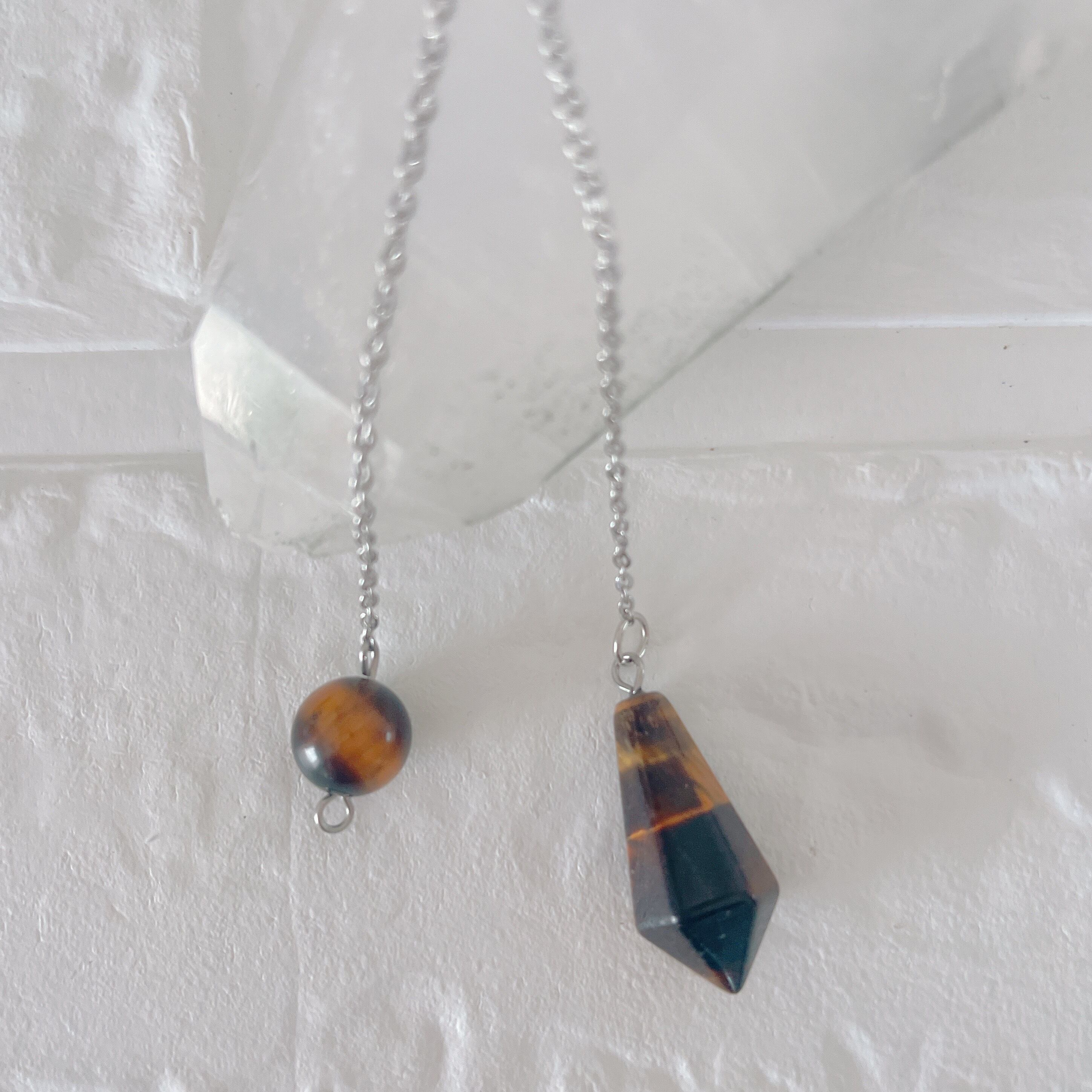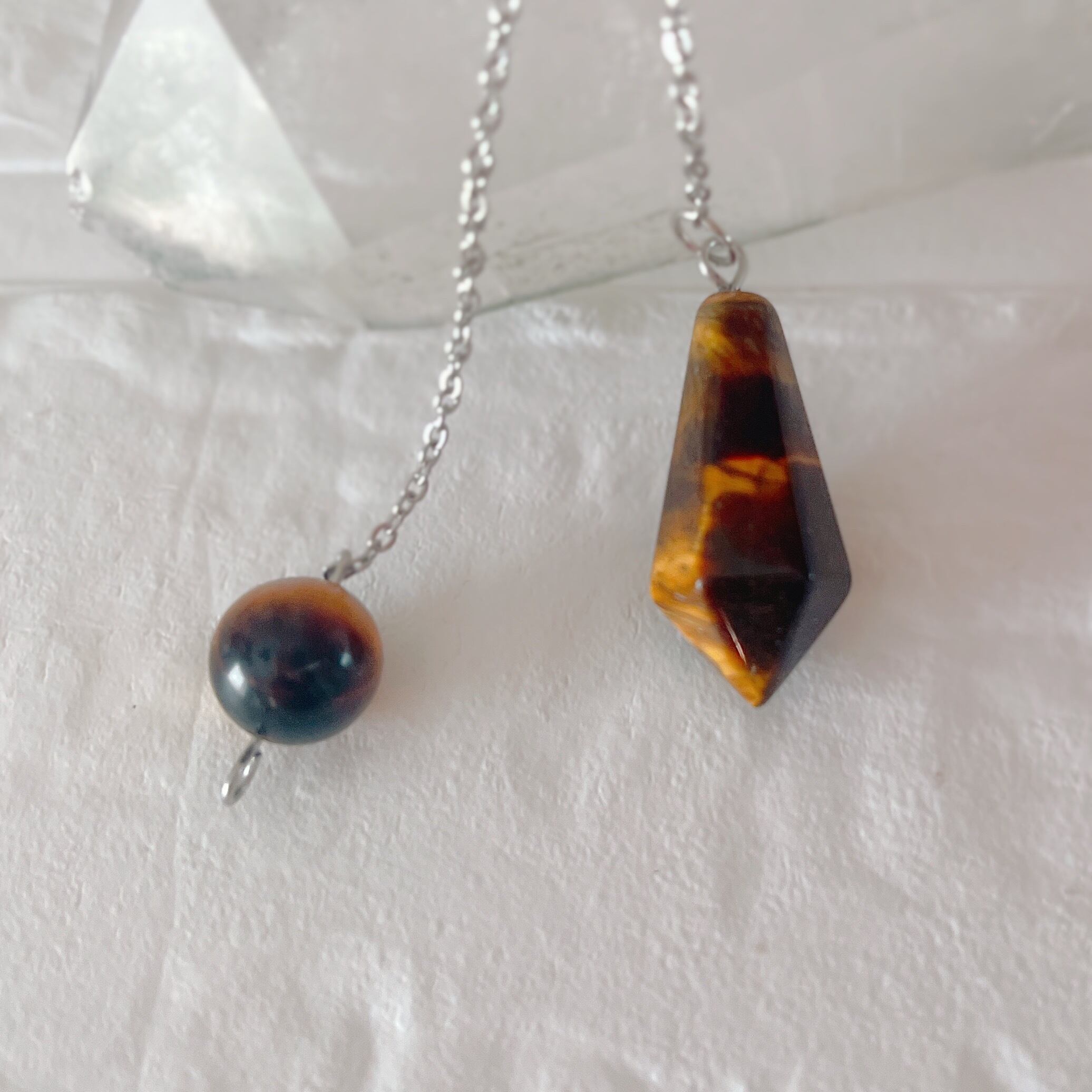 ペンジュラム「タイガーアイ」は、虎目石とも呼ばれるパワーストーンで、光に反射してトラの眼のように輝いて見えるのが特徴です。