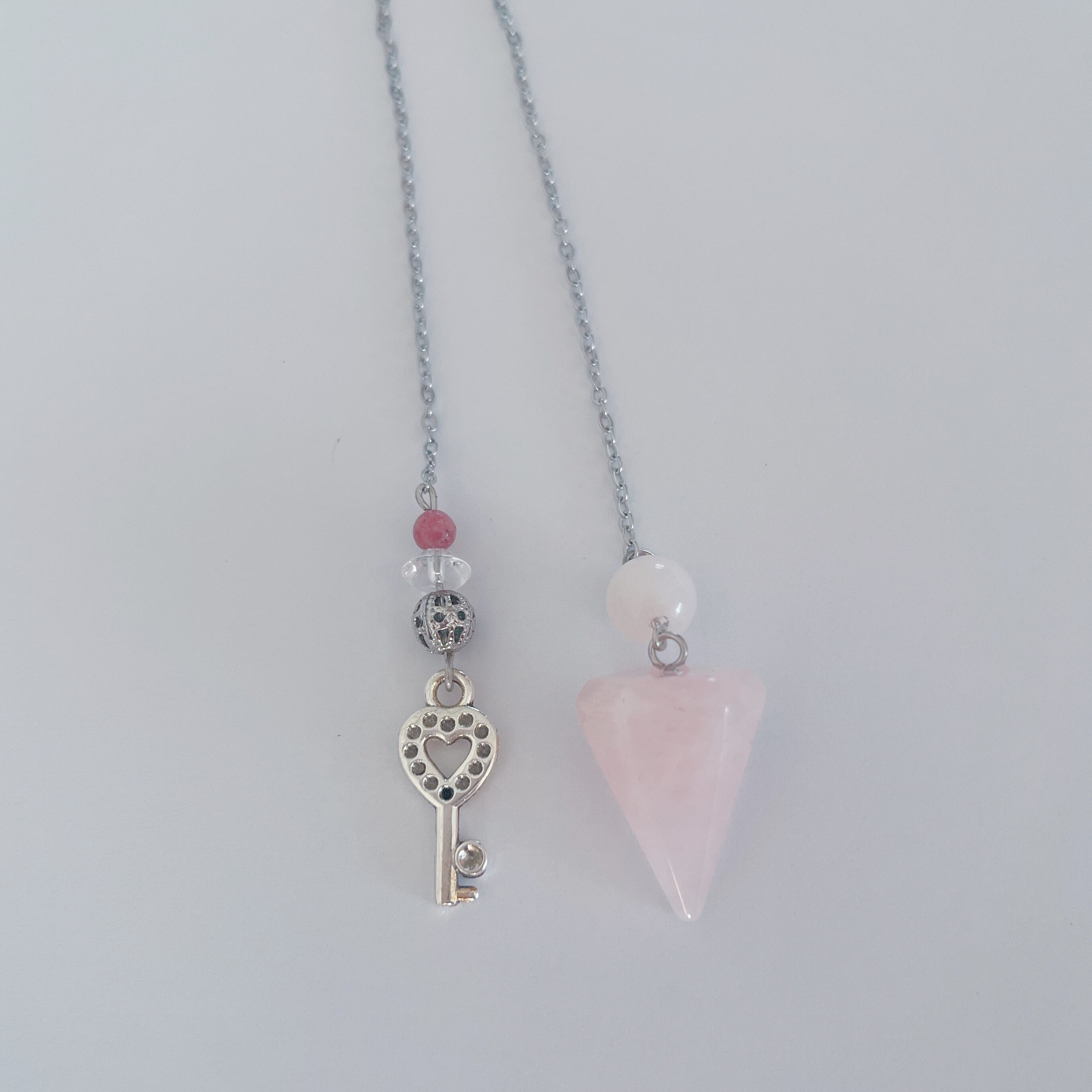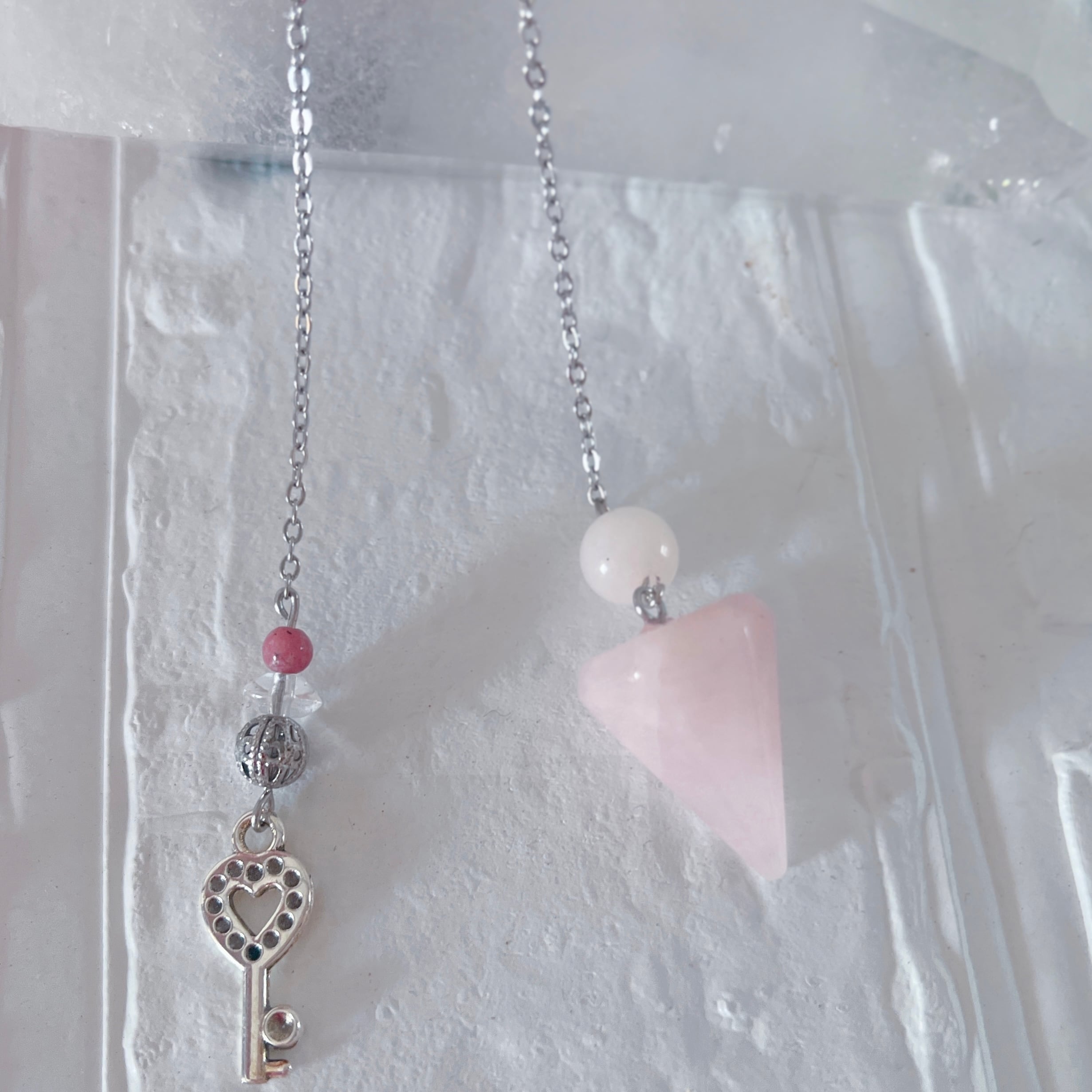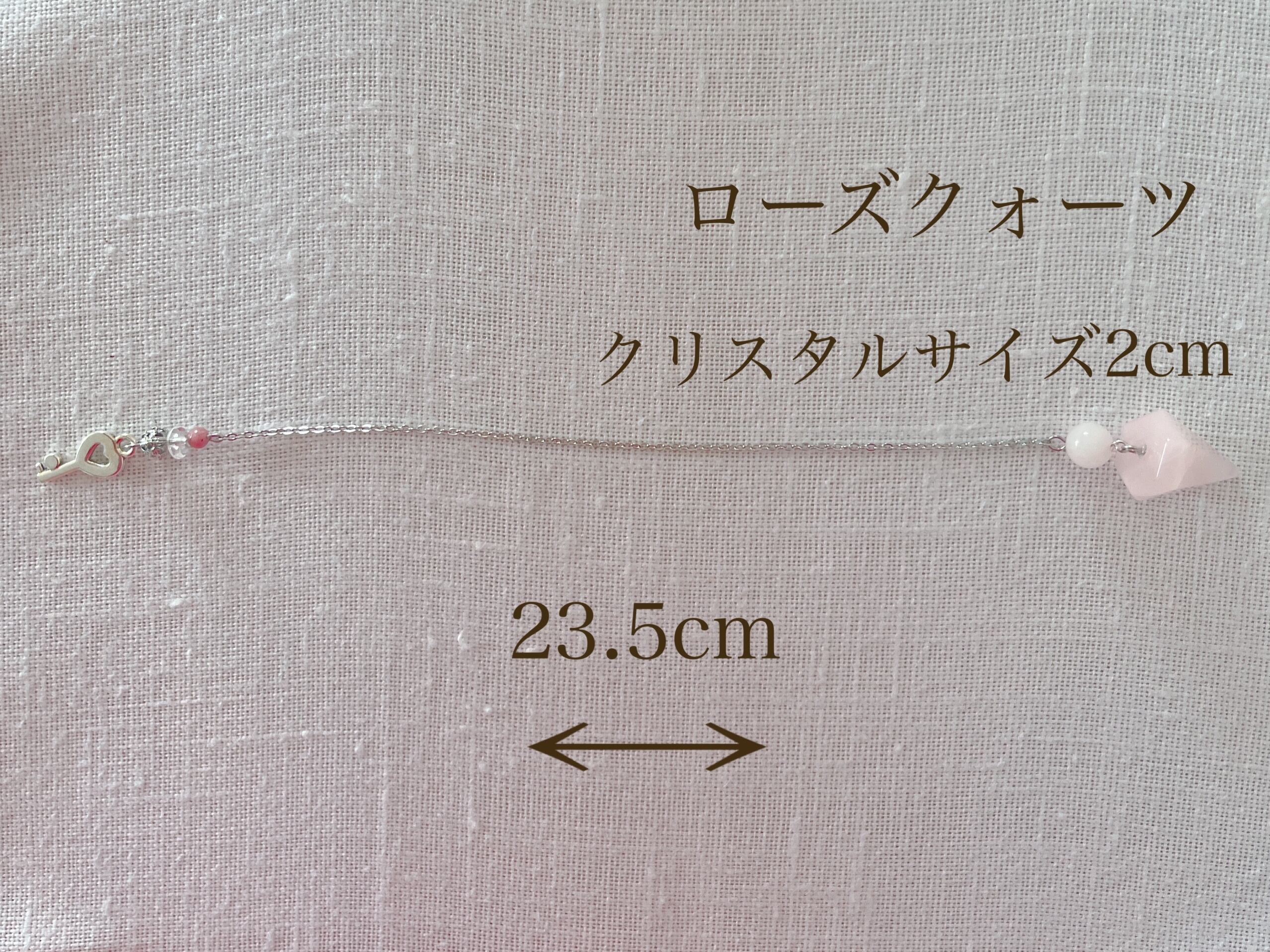 優しいピンクカラーのローズクォーツ、可愛らしいインカローズと水晶がついたペンジュラム。
