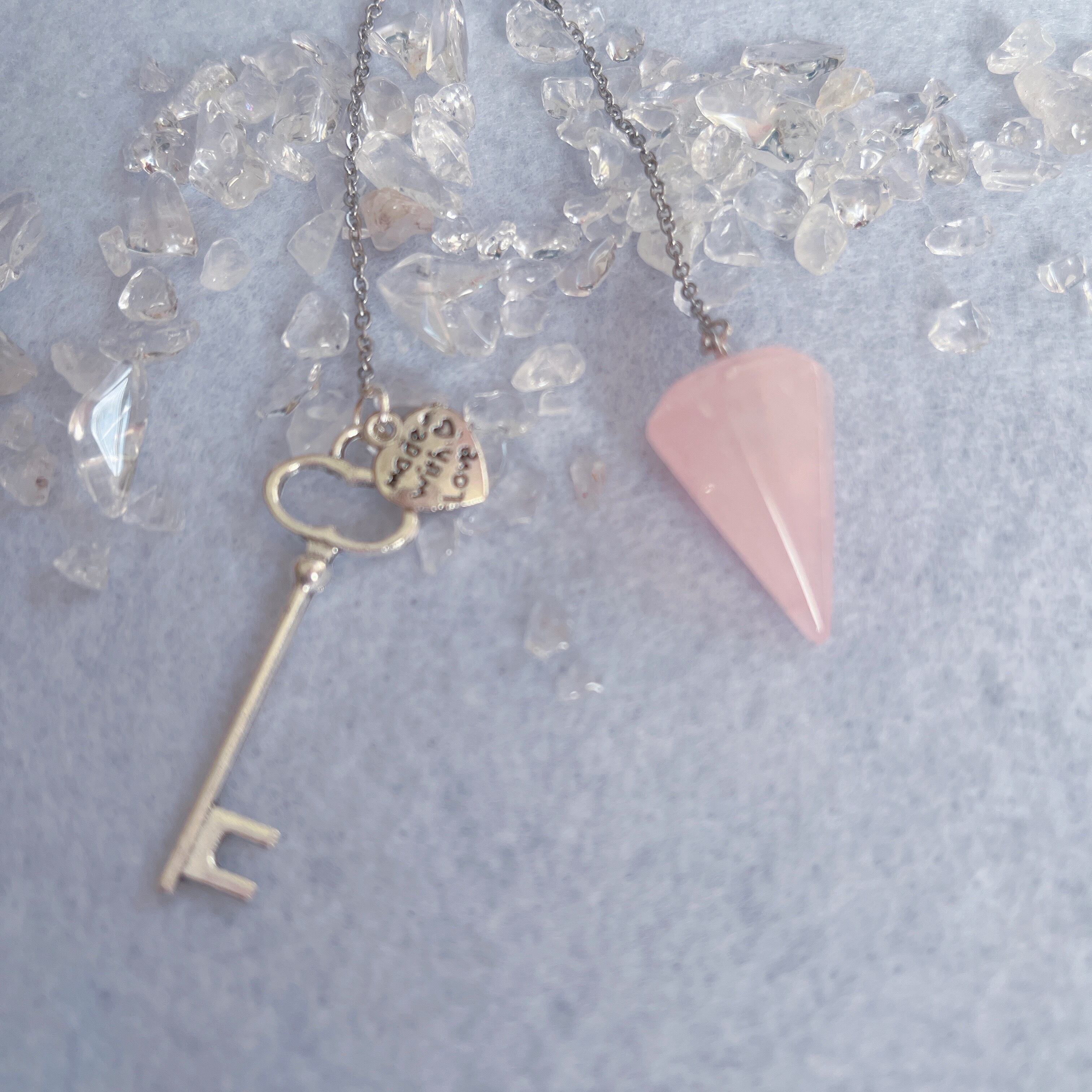 恋愛の守りの石「ローズクォーツ」のペンジュラムです。